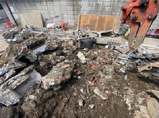 解体現場の下からは時に様々な地中障害物が出てきます。前に建物の古基礎や瓦・レ